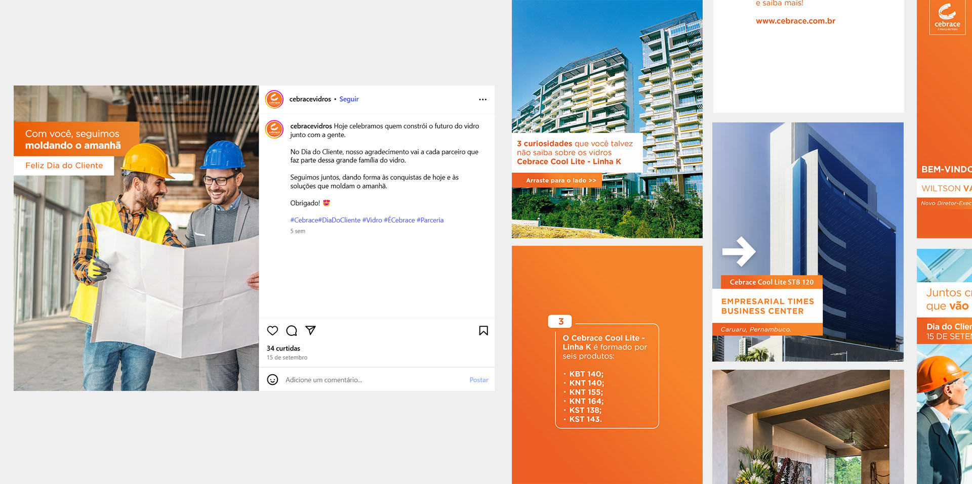 Fui chamada para atuar em um momento delicado da parceria com a Cebrace, quando a conta precisava de uma nova direção criativa. Desenvolvi uma nova identidade visual para a Cebrace, que completava 50 anos e participaria da maior feira da indústria de vidros da America Latina, a Glass South America. Aproveitamos a ocasião para criar o filme que ficaria no stand (inicialmente sem áudio, servindo apenas como recurso visual em uma tela acima do stand), implementando a nova identidade visual da marca, que foi super bem recebida por toda a diretoria, além de desenvolver a comunicação visual completa do stand.