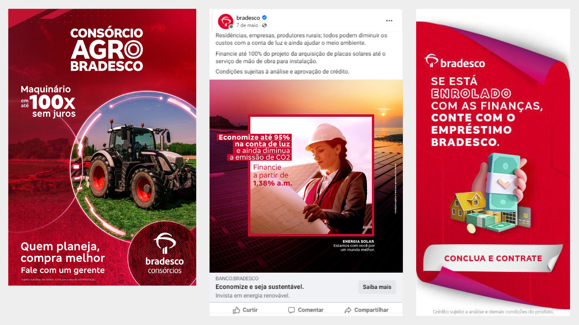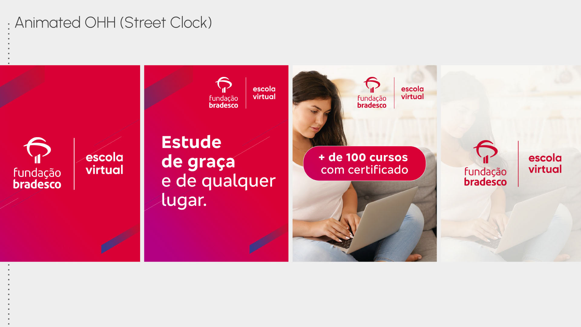 Para o Bradesco, desenvolvemos materiais estratégicos e criativos para fortalecer a presença da marca em canais digitais e físicos. Nosso trabalho incluiu ações On, como anúncios e publicações no LinkedIn; OOH, como relógios de rua e ativações de marca; e Off, incluindo flyers, além de peças derivadas e extensões, garantindo consistência em todos os pontos de contato. Cada execução foi pensada para gerar engajamento, clareza e conexão emocional, reforçando os valores do banco e promovendo impacto real.