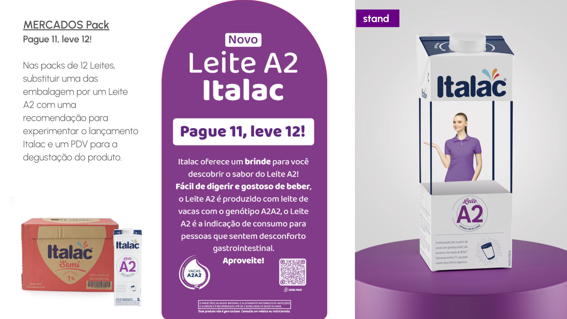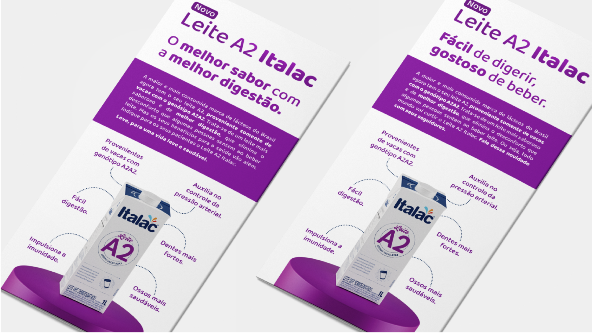 - Profissionais de saúde: kits informativos para médicos, destacando os benefícios do leite A2 para a saúde intestinal, possibilitando recomendações aos pacientes.