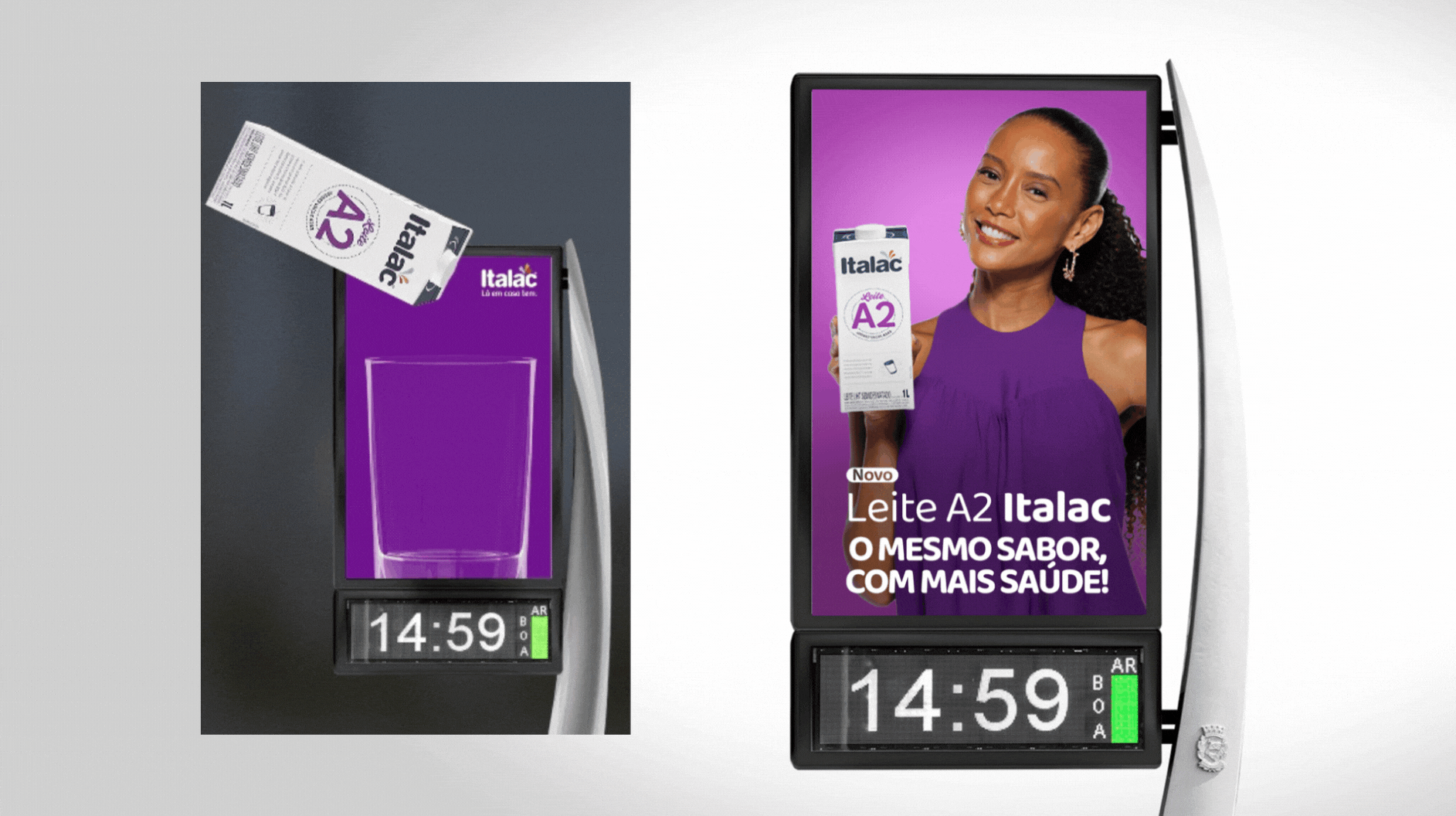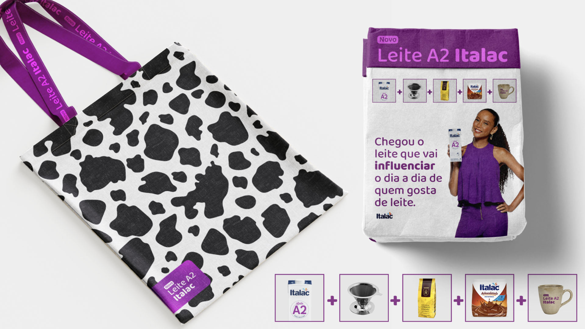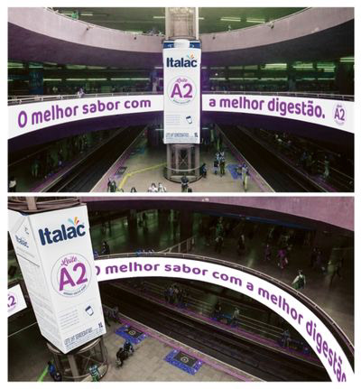 Além disso, a campanha propõe ações urbanas de alto impacto, como a intervenção no Metrô de São Paulo, onde o elevador da estação Sé é envelopado e transformado em uma grande caixa de Leite Italac A2, acompanhado de banners e painéis informativos sobre os benefícios do produto.